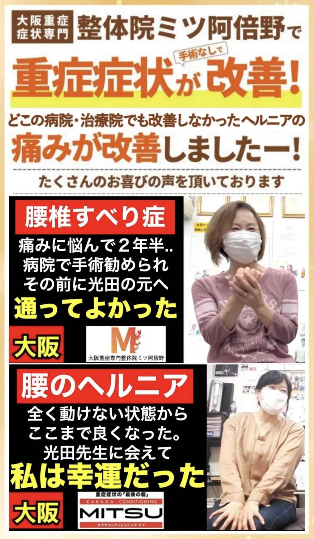 あなたが、少しでも「腰痛」「神経痛」を改善したいと思うのであれば、『大阪重症症状専門整体院ミツ阿倍野』があなたの人生を大きく変える出会いのタイミング、人生のきっかけになるはずです!