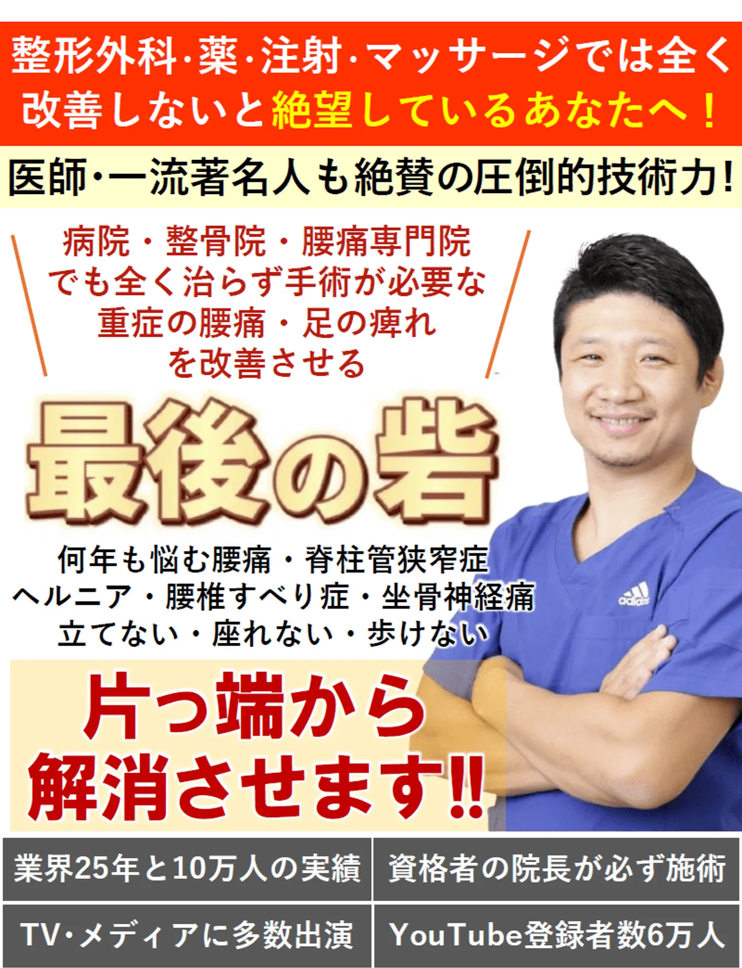 - 3件以上の病院・整骨院・整体・カイロなどに通ってみたが改善せず痺れを伴う重度の腰痛